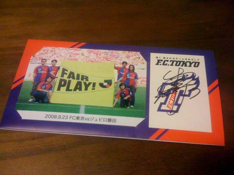 好きな選手1名のサインを入れて送ります、とのことだったので迷った上で浅利選手にしました。どうせなら今野とか長友とか日本代表クラスの選手がいいかとも思ったけど、ちょうどその時期は城福さんの新しいサッカースタイルにベテランながら果敢に挑戦している浅利選手に心打たれていたんだよね。特に社員選手となるとサラリーマンの自分と重ね合わせちゃうし。ま、結果的に浅利選手にしておいて良かったのかもね。引退しちゃったらもうこれにサイン貰えないもんな。