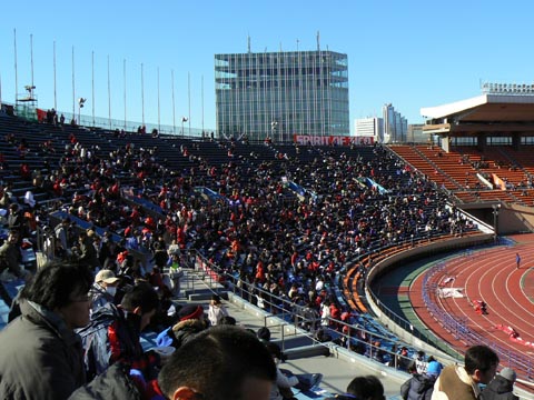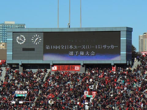 この日の国立は15時から天皇杯準決勝浦和vs.鹿島の試合があり、高円宮杯決勝はその前座扱い。既に両チームのサポーターが入ってます。もちろんユースの試合だけを観に来た東京サポーターもちらほら。